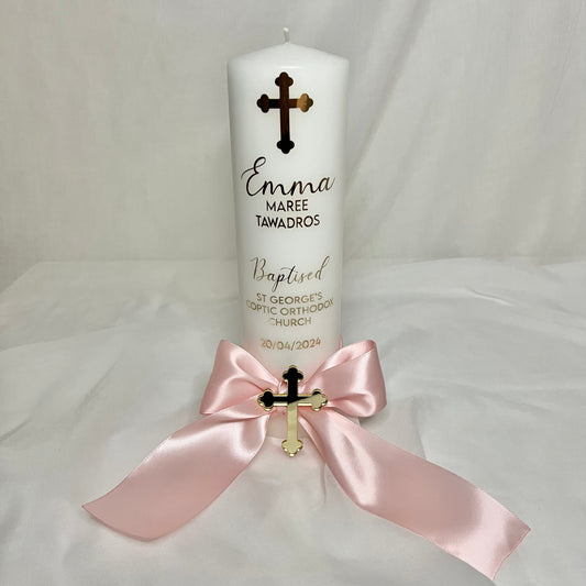 Christening Baptism Candle - Script Style W/ Acrylic Cross